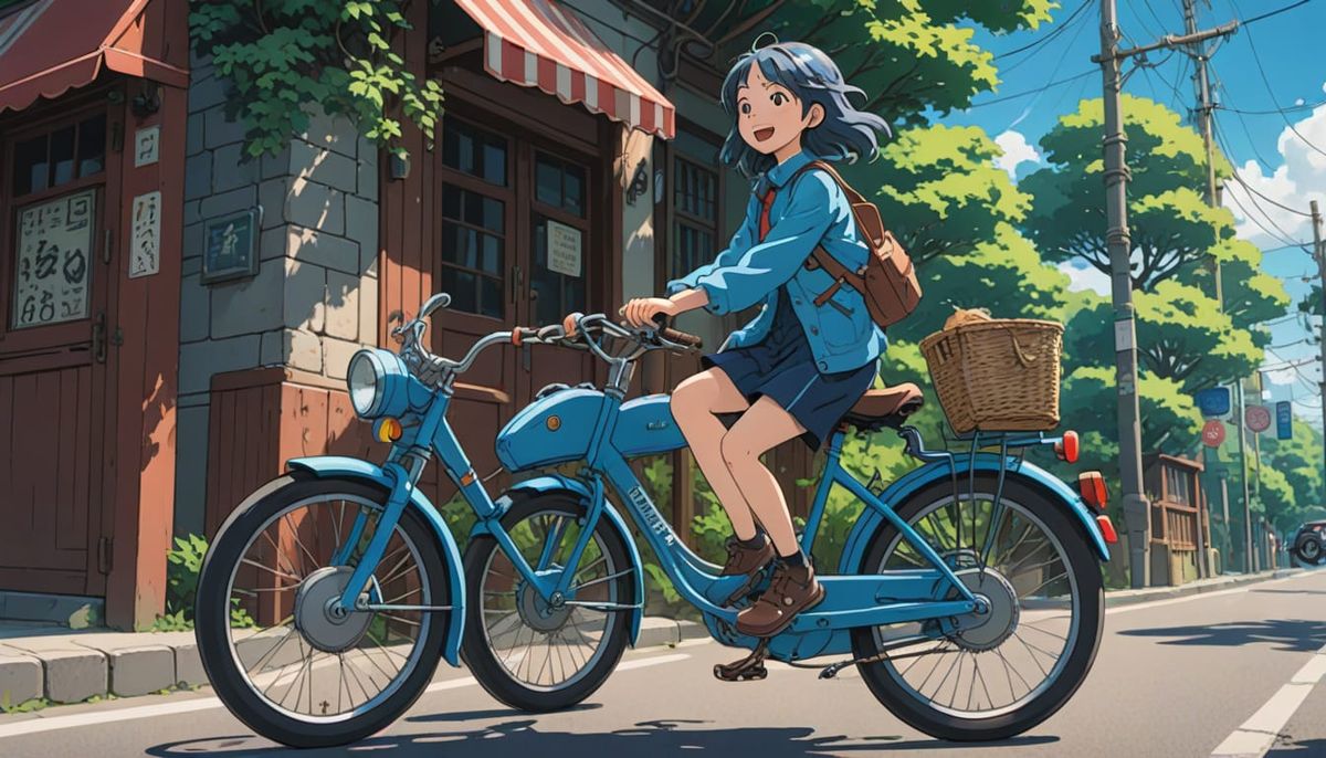 This image shows a cute Ghibli-style cartoon girl riding a blue bike. The full-color illustration has a flat, cel-shaded anime aesthetic with deep color and cinematic lighting.