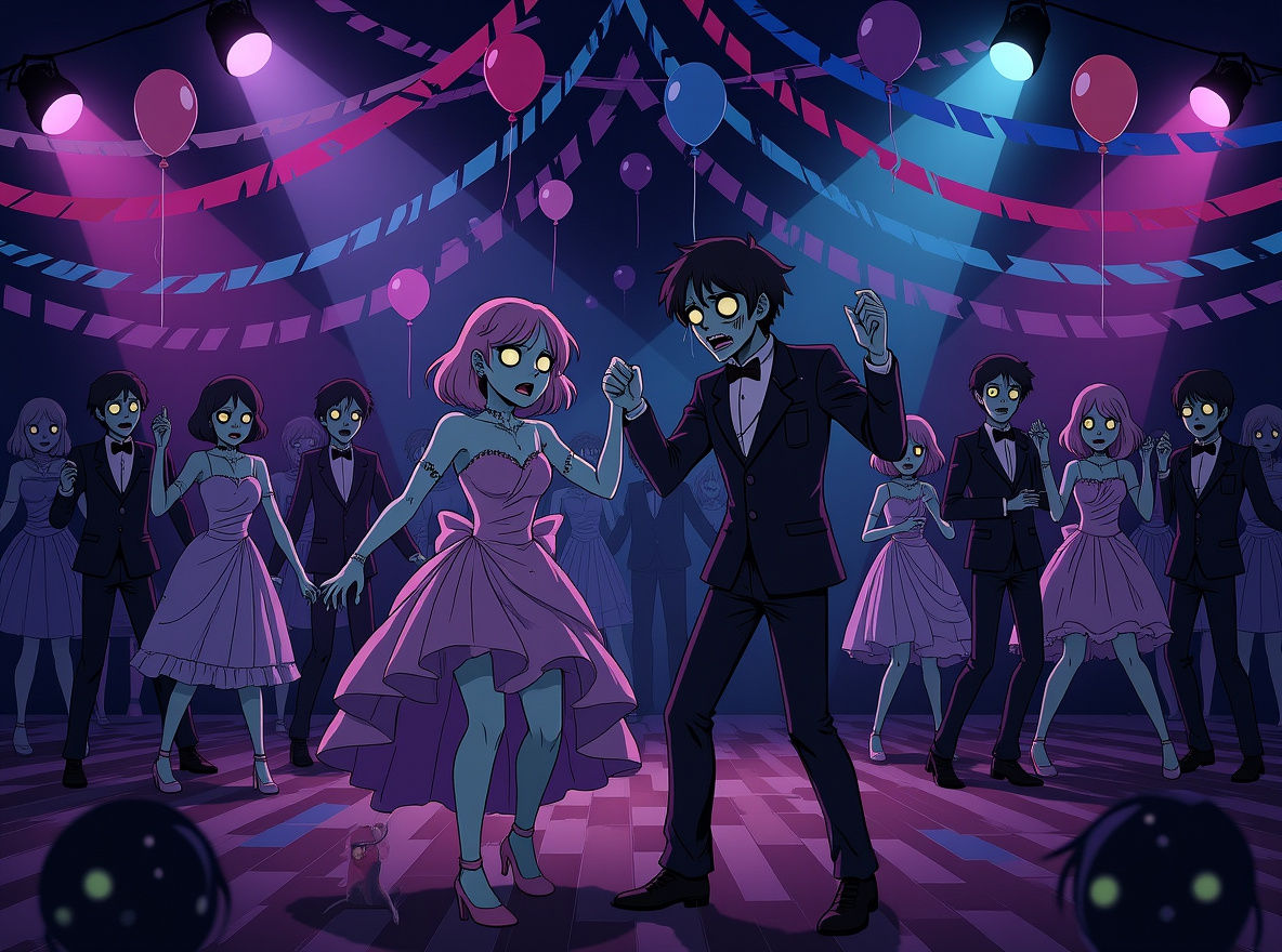Zombie Prom Night, anime style inspired by 1980s–2000s classics, set in a Japanese high school gym decorated for prom with faded pastel streamers and floating torn balloons, undead students dancing with eerie, haunting expressions, pale gray and purple skin with subtle cracks and decay, tattered formal dresses and suits with frayed edges and faded ribbons, eyes glowing faintly with ghostly light, flickering disco lights in pink, blue, and indigo casting dynamic shadows, cinematic composition with shallow depth of field, camera angle highlighting the creepy elegance of the zombies while keeping nostalgic anime proportions, 2024 ultra-high detail clarity, cel-shaded with textured line art, atmosphere both melancholic and spooky