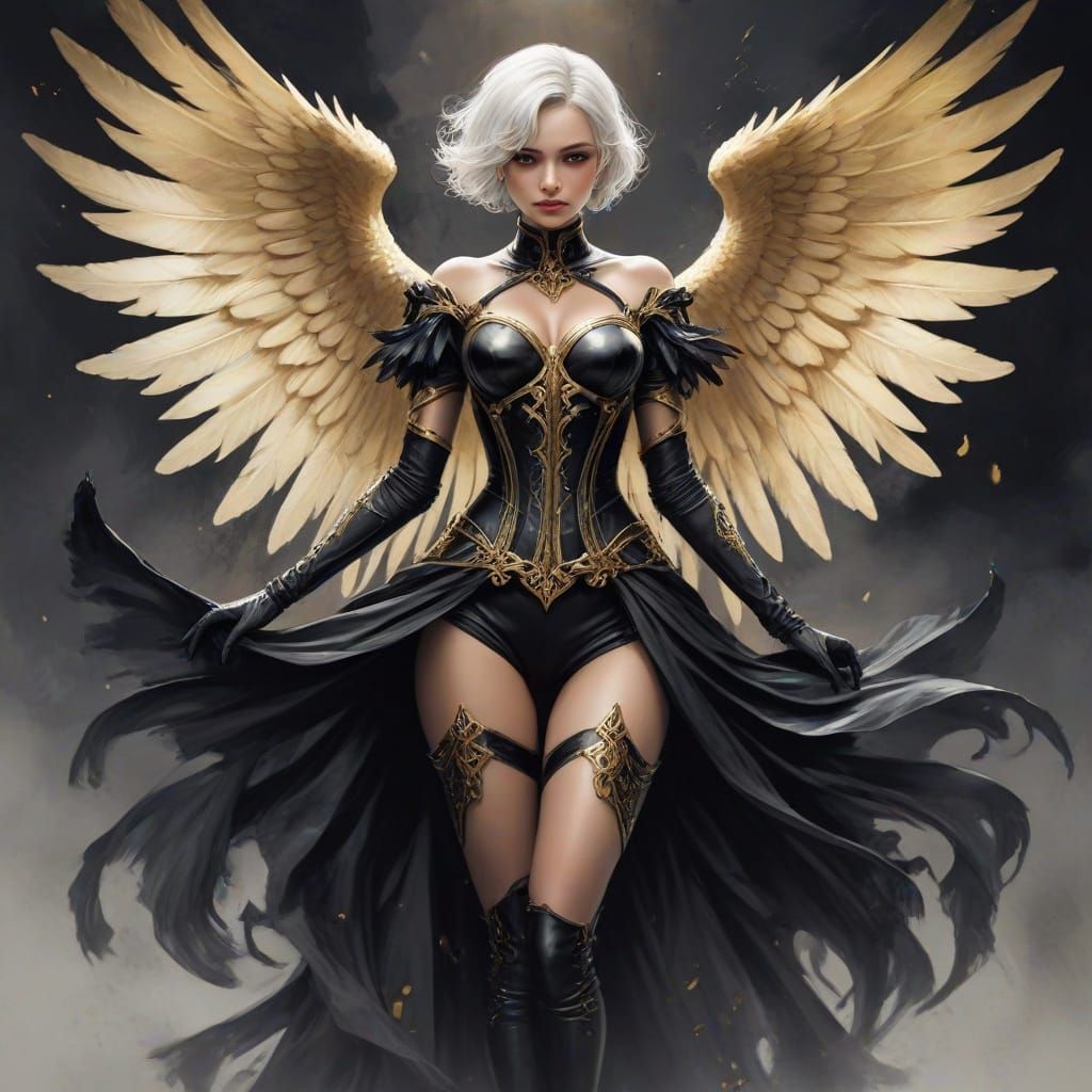 A full-body image of a dark angel in watercolor style. The angel wears a black and gold outfit with black gloves, and has short gray and white hair, all rendered with a moody, dreamlike aesthetic.