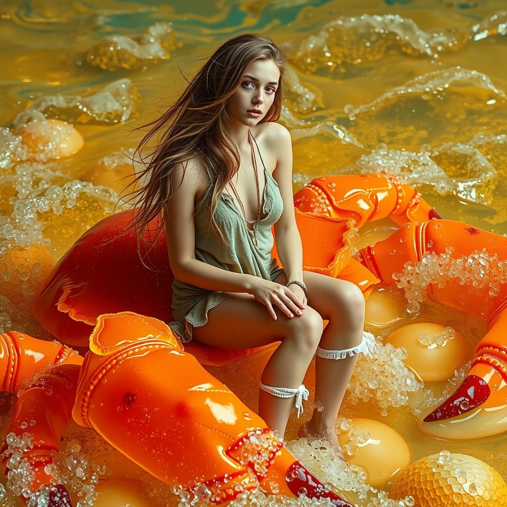 A captivating image of a young woman with golden hair sitting atop a massive gummy crab in a sea of fizzy soda. The scene evokes neon futurism and delicate textures.