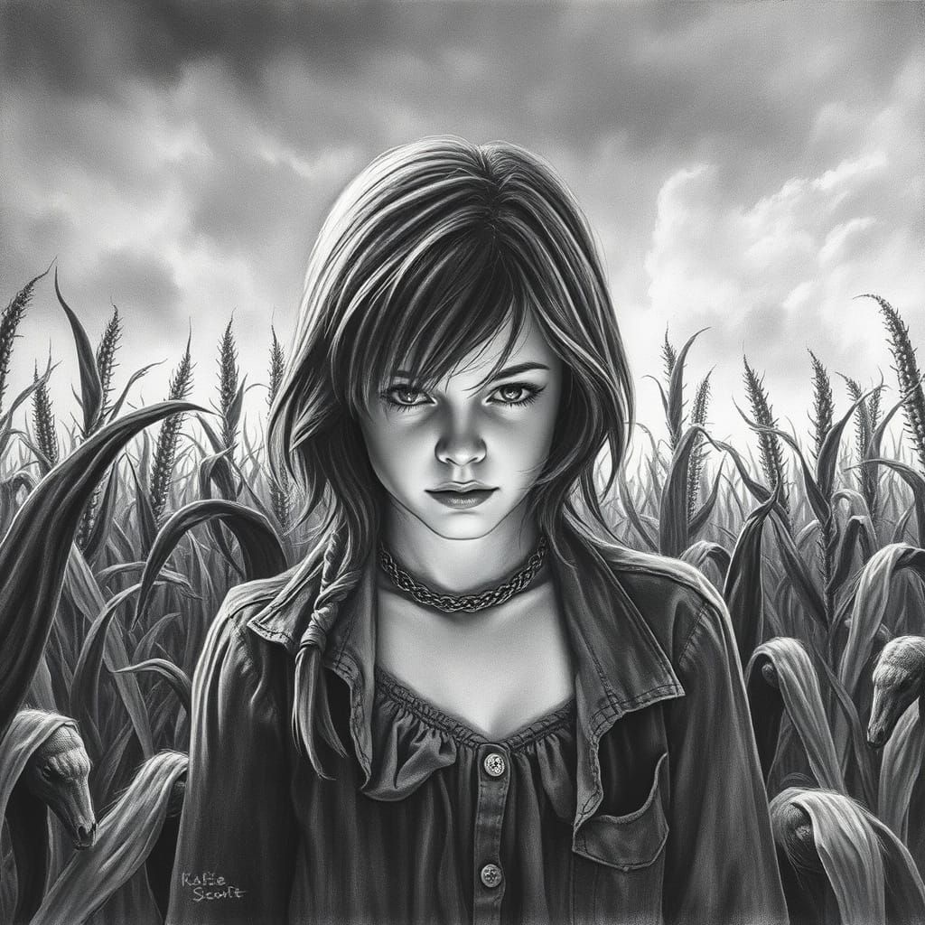 This image is a hyperdetailed charcoal drawing, designed as a movie poster for 'Children of the Corn'. It captures a dark and detailed artistic vision.