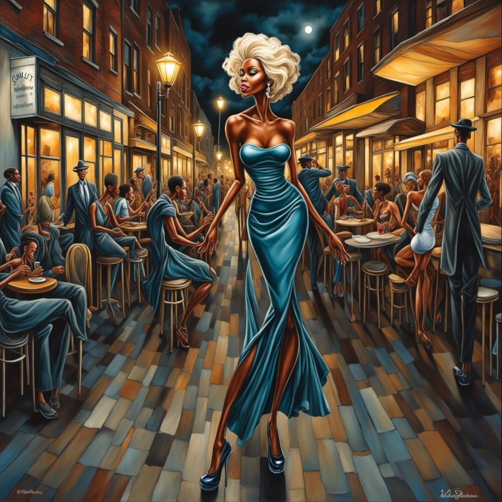 This oil on canvas painting features a striking portrait of a woman in a tailored gown and heels, with platinum blonde hair and dramatic makeup, set against a Nashville night scene.