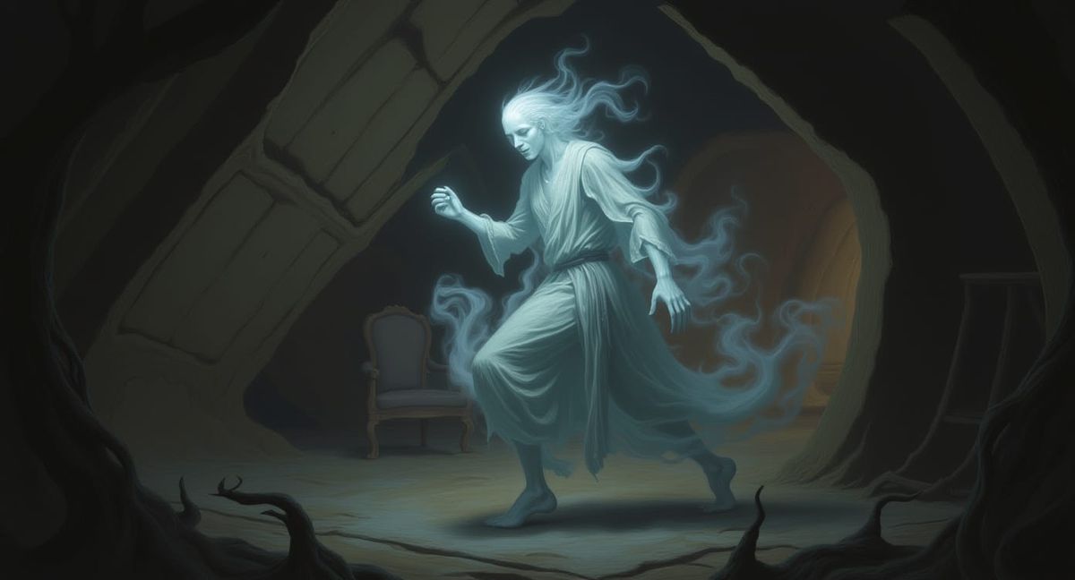 This image shows a spectral figure composed of smoke, struggling for balance in a warped, dreamlike setting. Furniture and walls are distorted at impossible angles, rendered with hyperrealism and soft watercolor textures, creating an atmospheric scene.