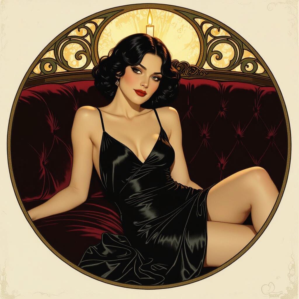 This image shows a woman in a black silk dress lounging on a velvet couch. The dim lighting and suggestive pose evoke a sensual, mysterious atmosphere in an art nouveau style.