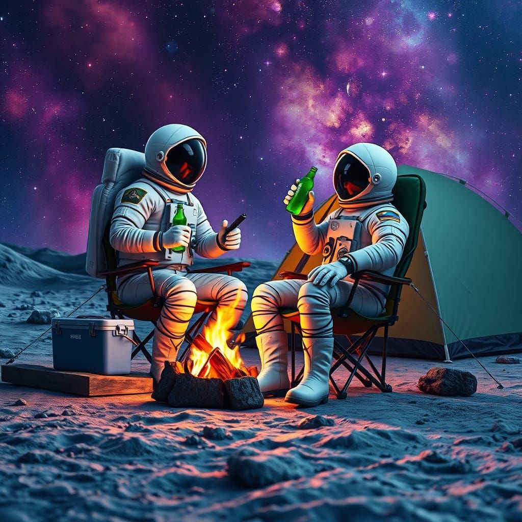This image shows a serene astronaut scene on the moon, featuring a campsite with a campfire, tent, and a fantastical galaxy background, created in detailed matte painting style with deep colors and intricate details.