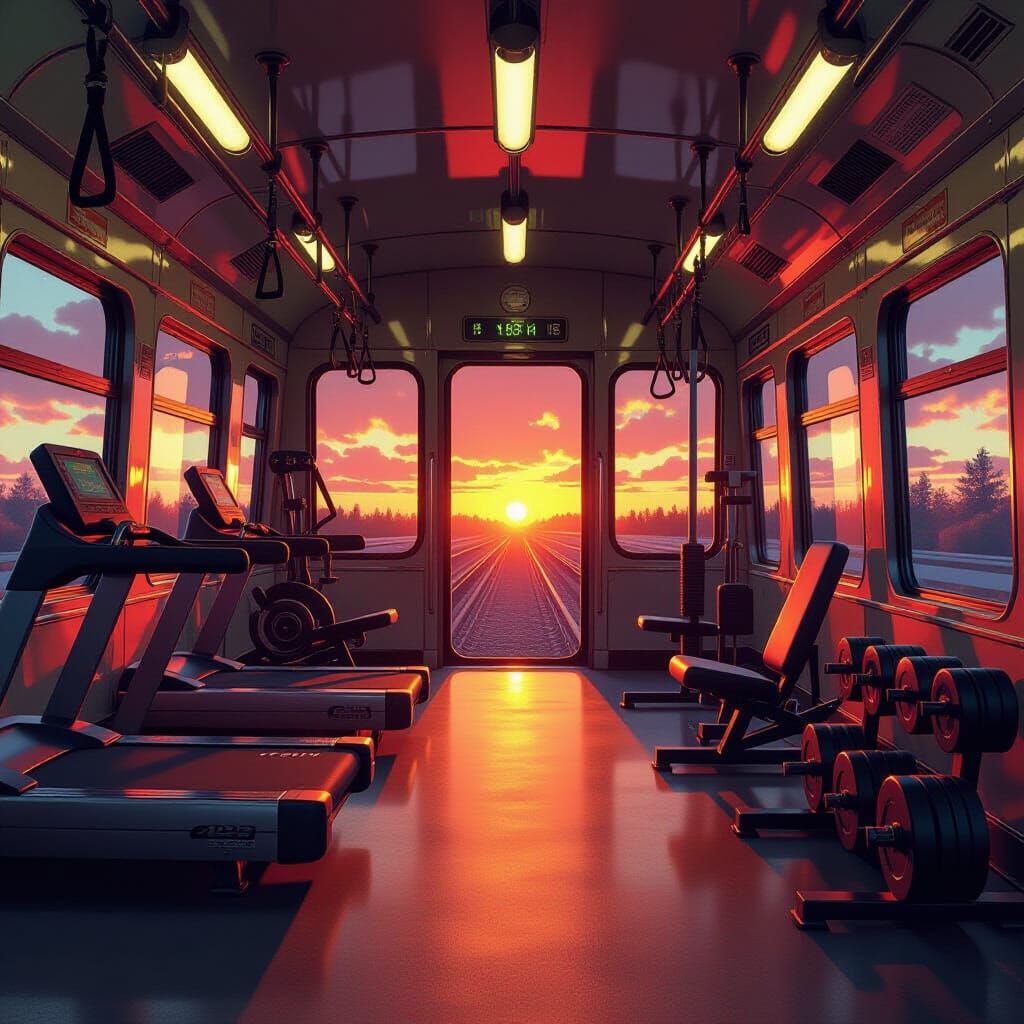 This image depicts a train car converted into a gym, featuring various exercise equipment. Warm sunset light streams through the windows, highlighting the detailed machinery and atmospheric lighting.