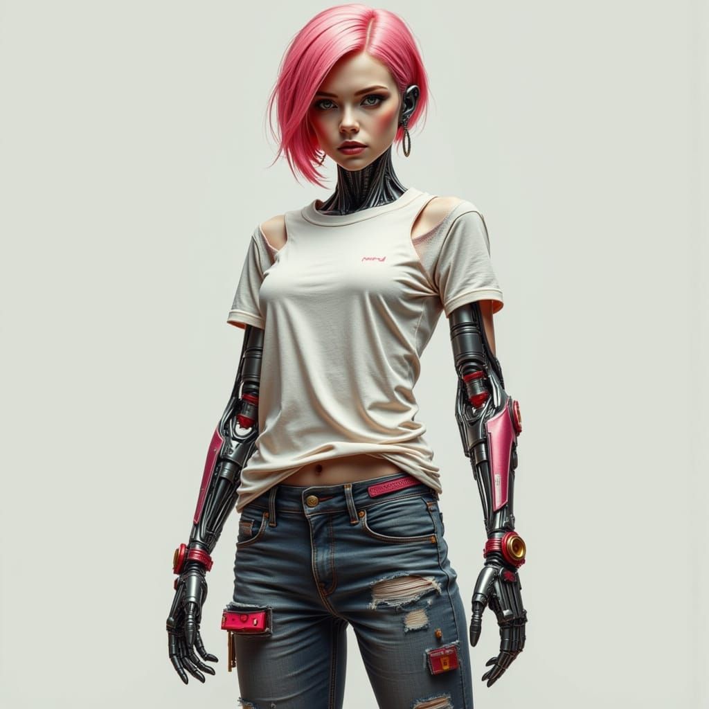 This image shows a colorful, highly detailed cyborg with visible kinetic enhancements in a bio-punk style. The cyborg has short pink hair and is wearing casual clothing.