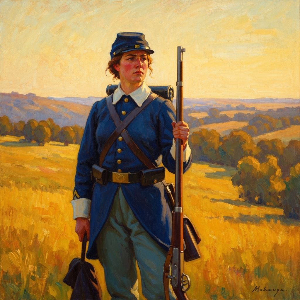 This image shows a female Union soldier standing with her rifle against a golden American landscape. The piece evokes impressionist oil paintings through vivid colors and bold brushstrokes.
