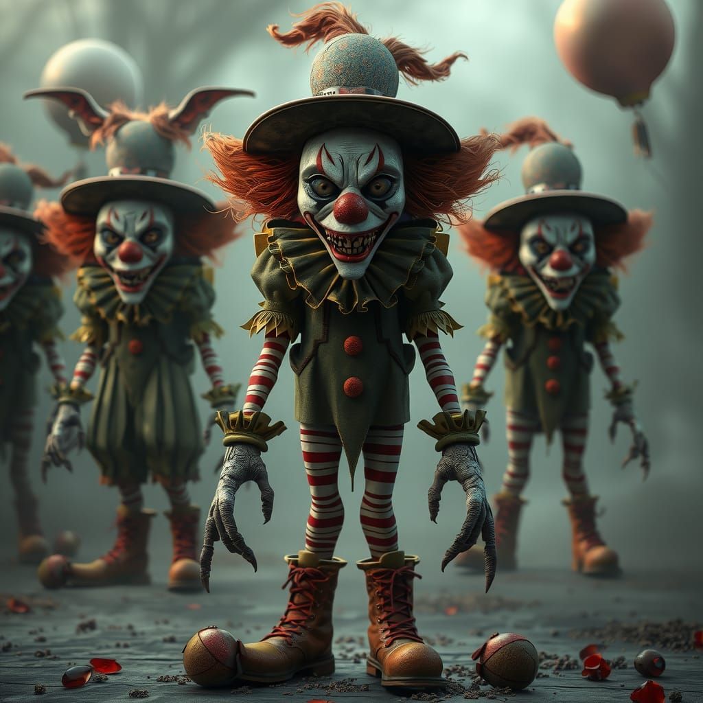 A series of terrifying clown characters in a surreal gothic style. The image features exaggerated features, elongated limbs and whimsical clothing, rendered as a detailed matte painting with complementary colors.