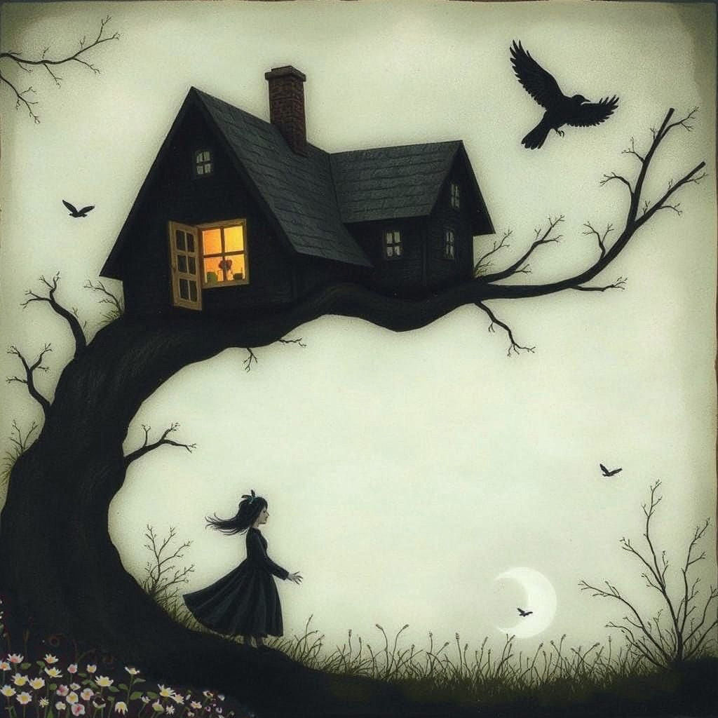 This enchanting image depicts a young girl walking away from a house, holding its heart and a music box, as a bird with a melodic song follows closely behind.