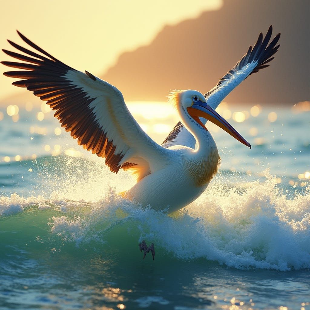 This image shows a pelican joyfully playing in ocean waves during golden hour. Rendered with dynamic brushstrokes and a rich color palette, capturing the movement and light of the sea.