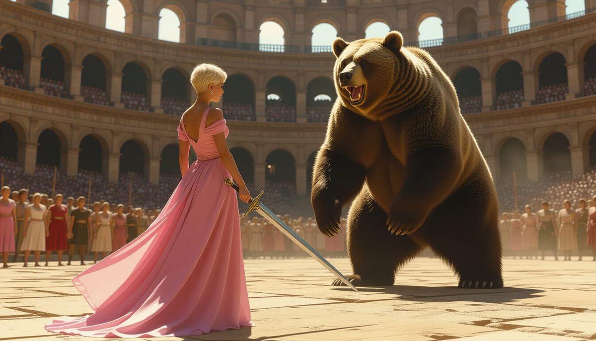 A striking picture of an amazonian woman with short blonde hair in a pink dress, wielding a sword. She stands in an ancient colosseum facing a massive bear, rendered with photorealistic textures and atmospheric lighting.