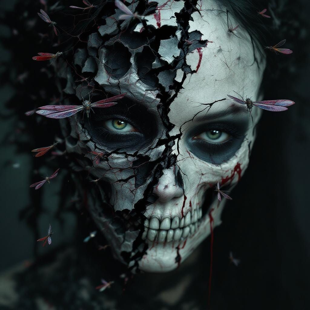 This image shows a gothic woman's face, half transforming into a weathered skull. Dragonflies emerge from the fractures in a hyperrealistic style, creating a surreal blend of horror and dreamlike symbolism with intricate details.