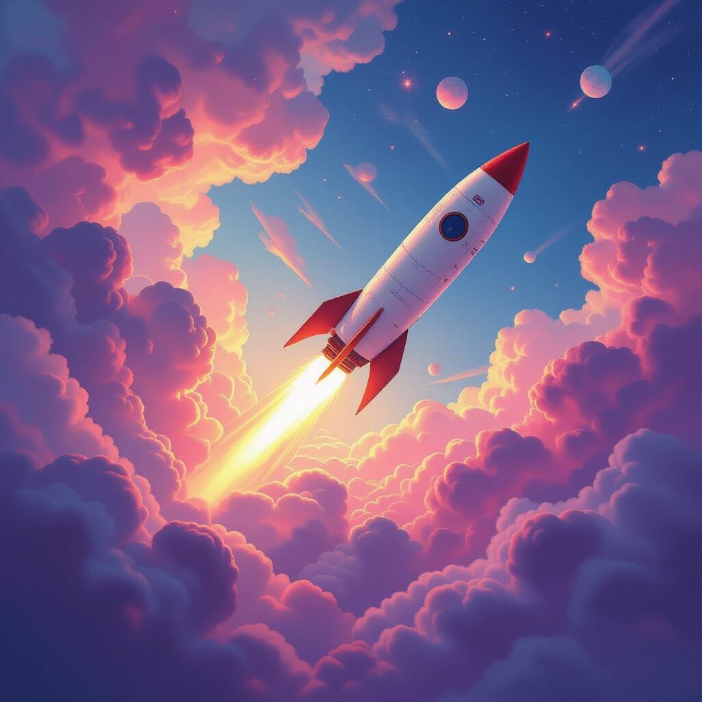 A vibrant rocket soaring through cosmic clouds, rendered as a detailed oil painting. The image features dramatic lighting and a maximalist composition in a surreal, astral aesthetic.