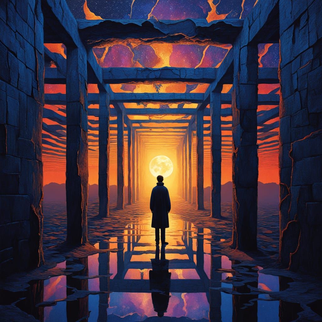 This digital painting shows a person holding a guiding star within a fractured mirror, surrounded by a surreal, labyrinthine landscape. It features deep blues and purples with gold accents, evoking a psychological and dreamlike atmosphere.