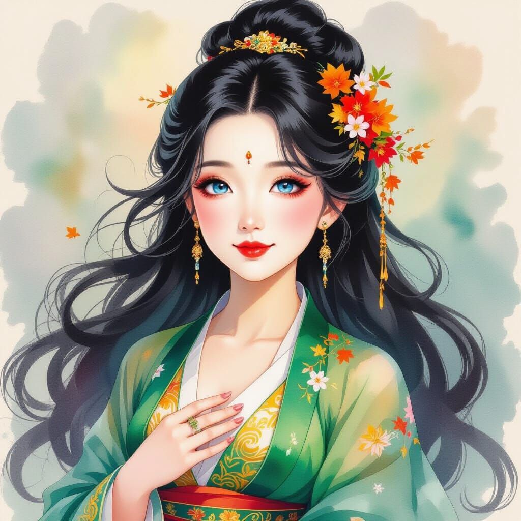 A surreal, dreamlike portrait of a cheerful Chinese woman with blue eyes and flowing black hair adorned with blossoms. Rendered in pastel watercolors with luminous lighting and silk gown details.
