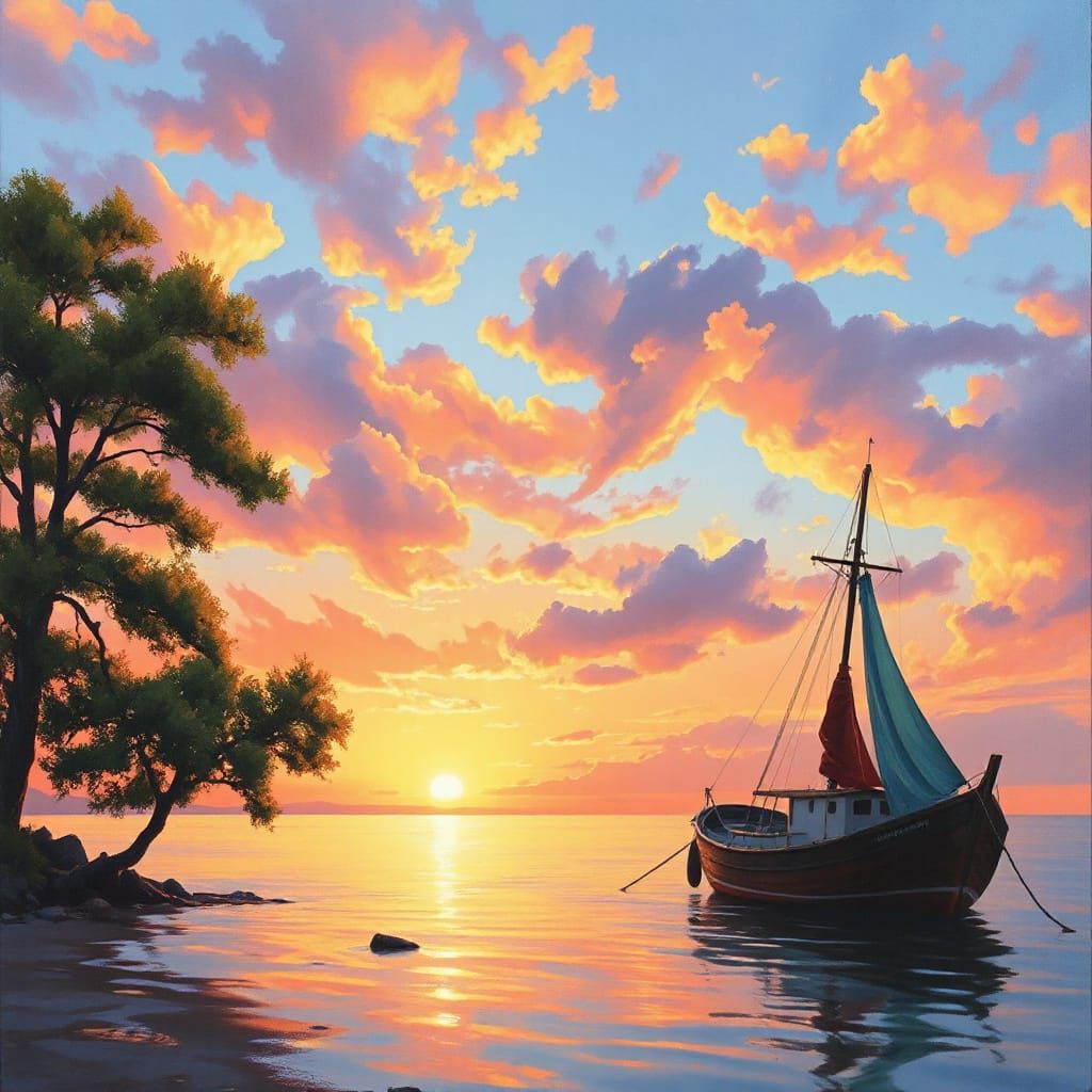 Generate unique pastel coastal sunset images with a fishing boat, free and easy. Start creating now!
