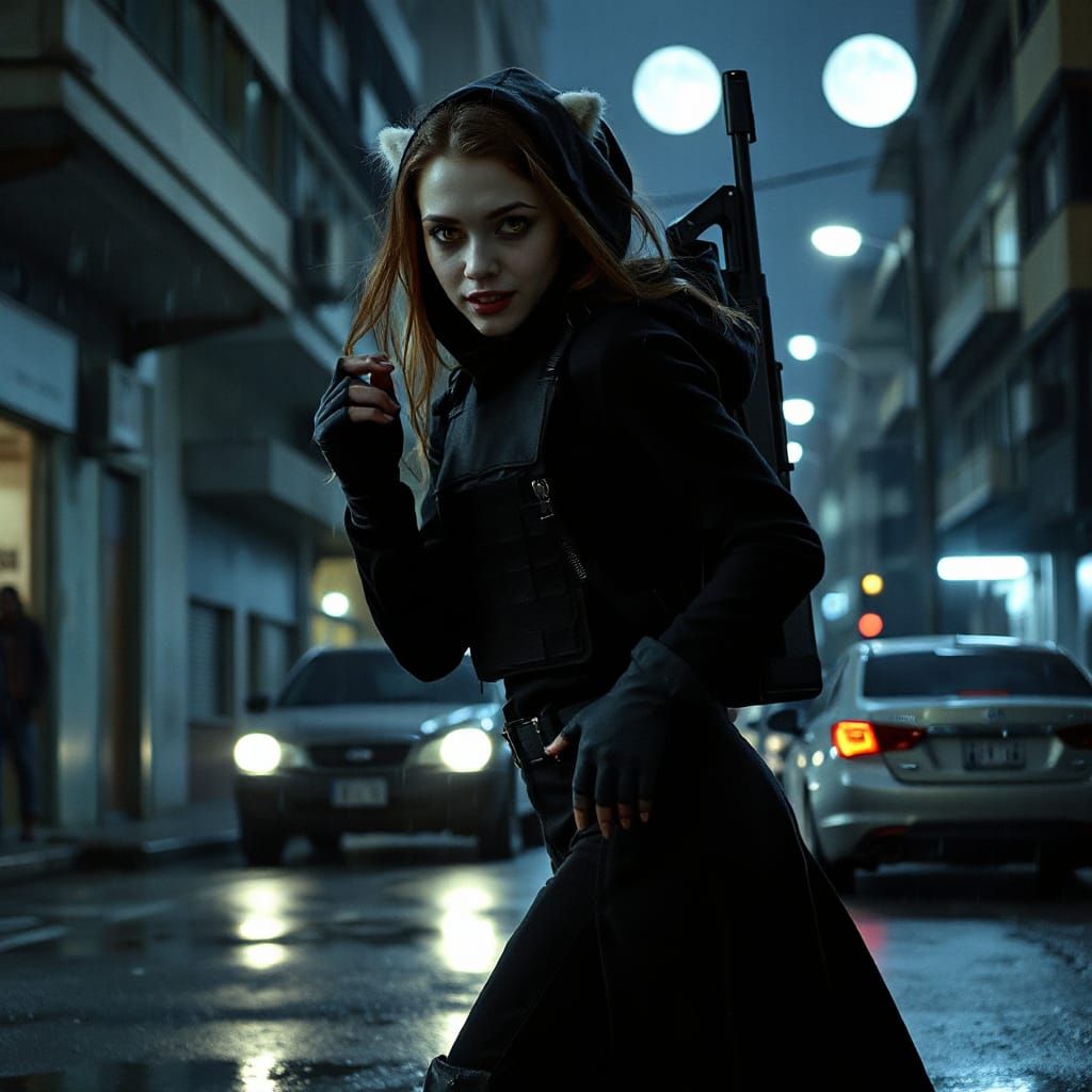 This cinematic image shows a fierce snow leopard vampire soldier with glowing eyes and sharp claws, wearing tactical gear in a rainy Rio favela at night. Shot with film grain for a dramatic effect.