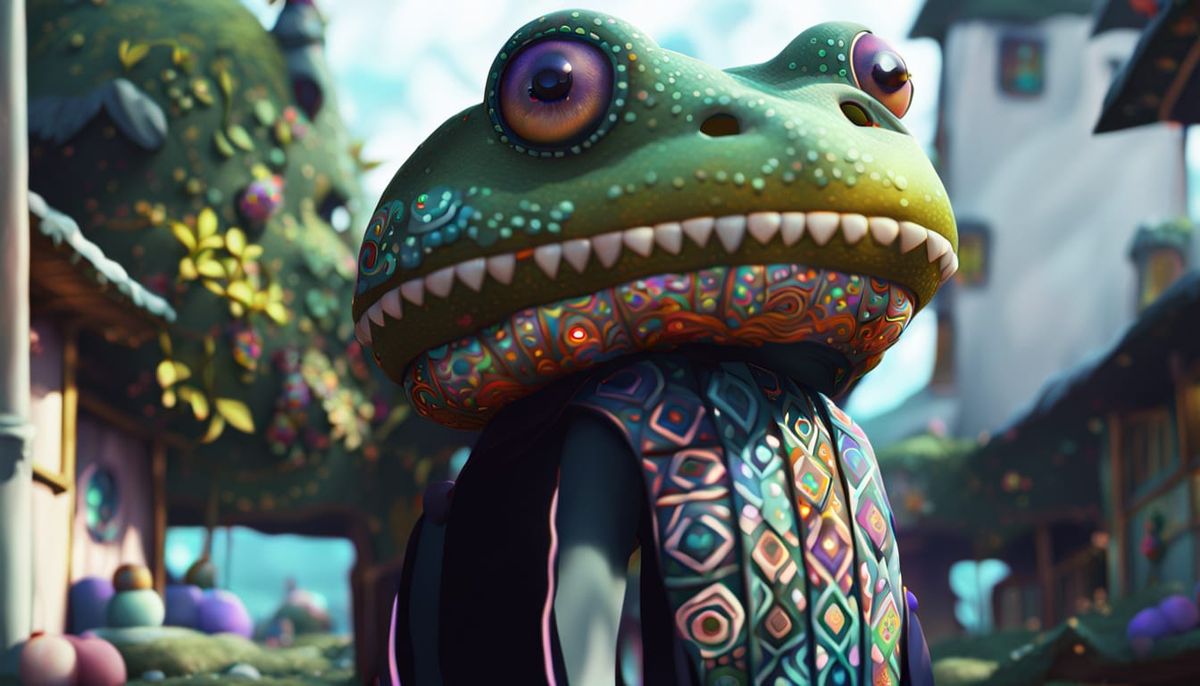 This image is a close-up of a fantastical girl sitting in a warm, colorful environment, surrounded by intricate patterns and glowing eyes, created in a Pixar style digital painting with high detail and bright colors.