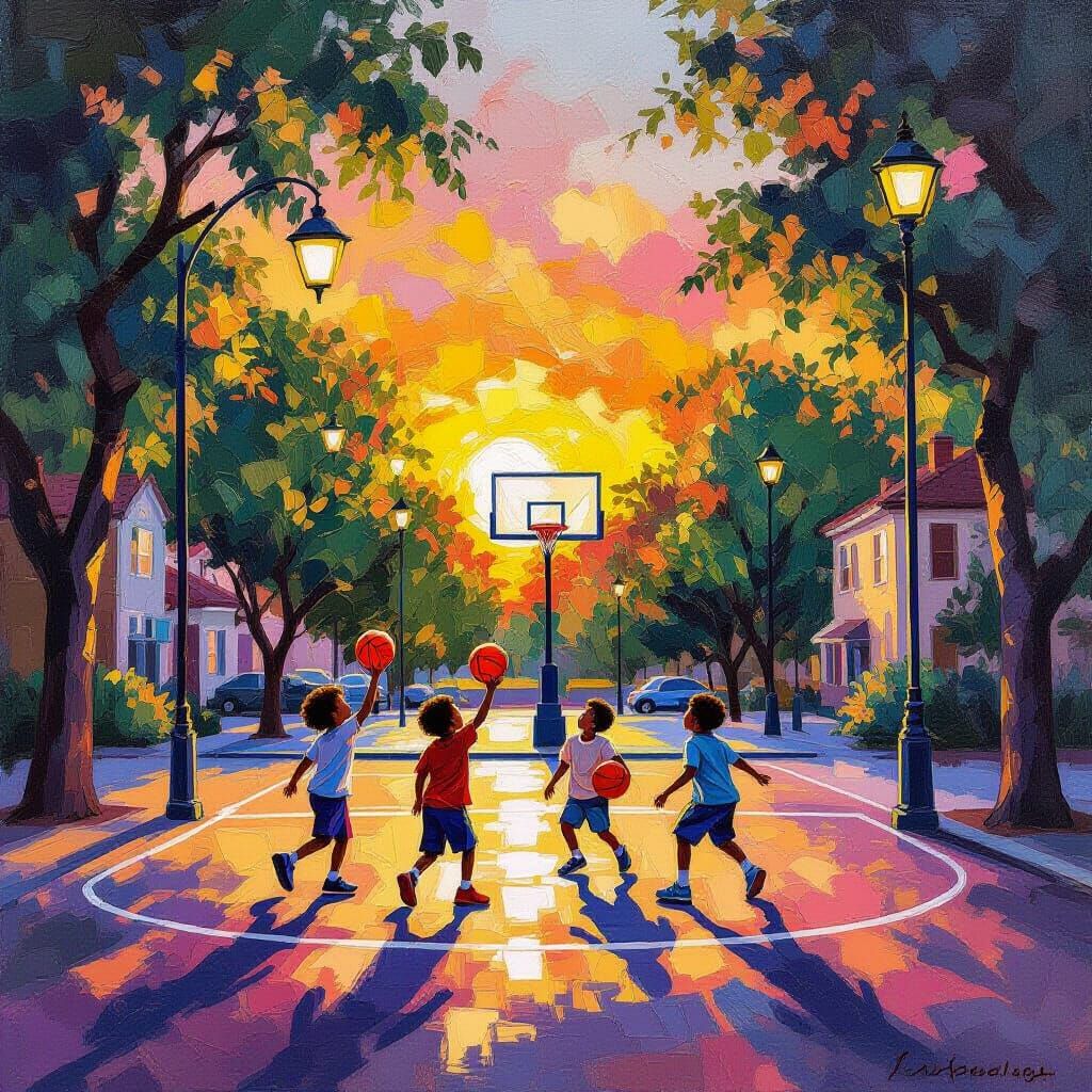 A vibrant neighborhood court at sunset shows kids playing basketball under street lights. The image is rendered in a gouache style, with thick brush strokes, impasto textures, and layered watercolors.
