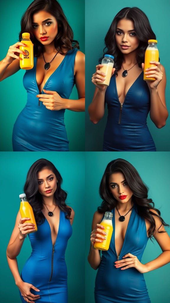 This image shows a glamorous young woman in a blue rubber dress playfully posing with a yellow milk bottle. Soft lighting enhances the rich colors and textures.