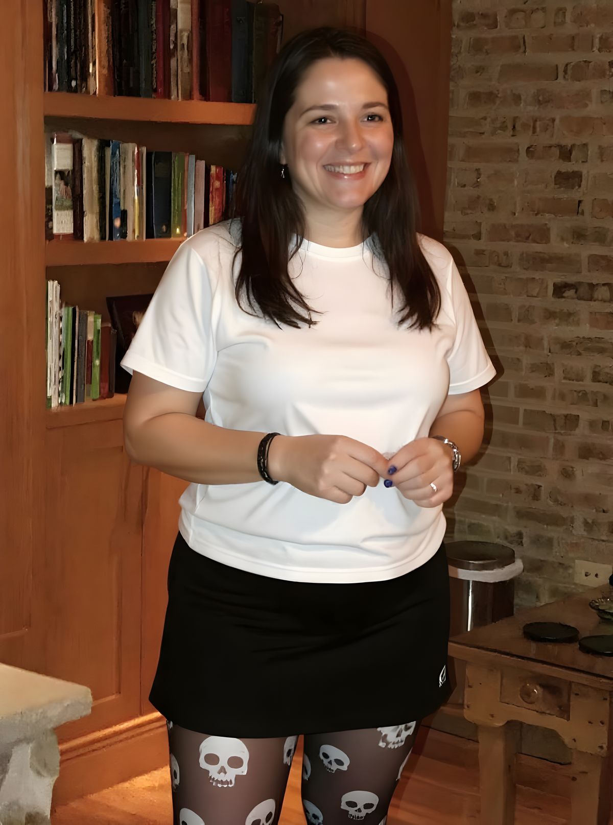 This image depicts a woman with flowing hair, wearing a form-fitting shirt. The picture has a defogged and denoised quality, evoking a casual retro aesthetic.