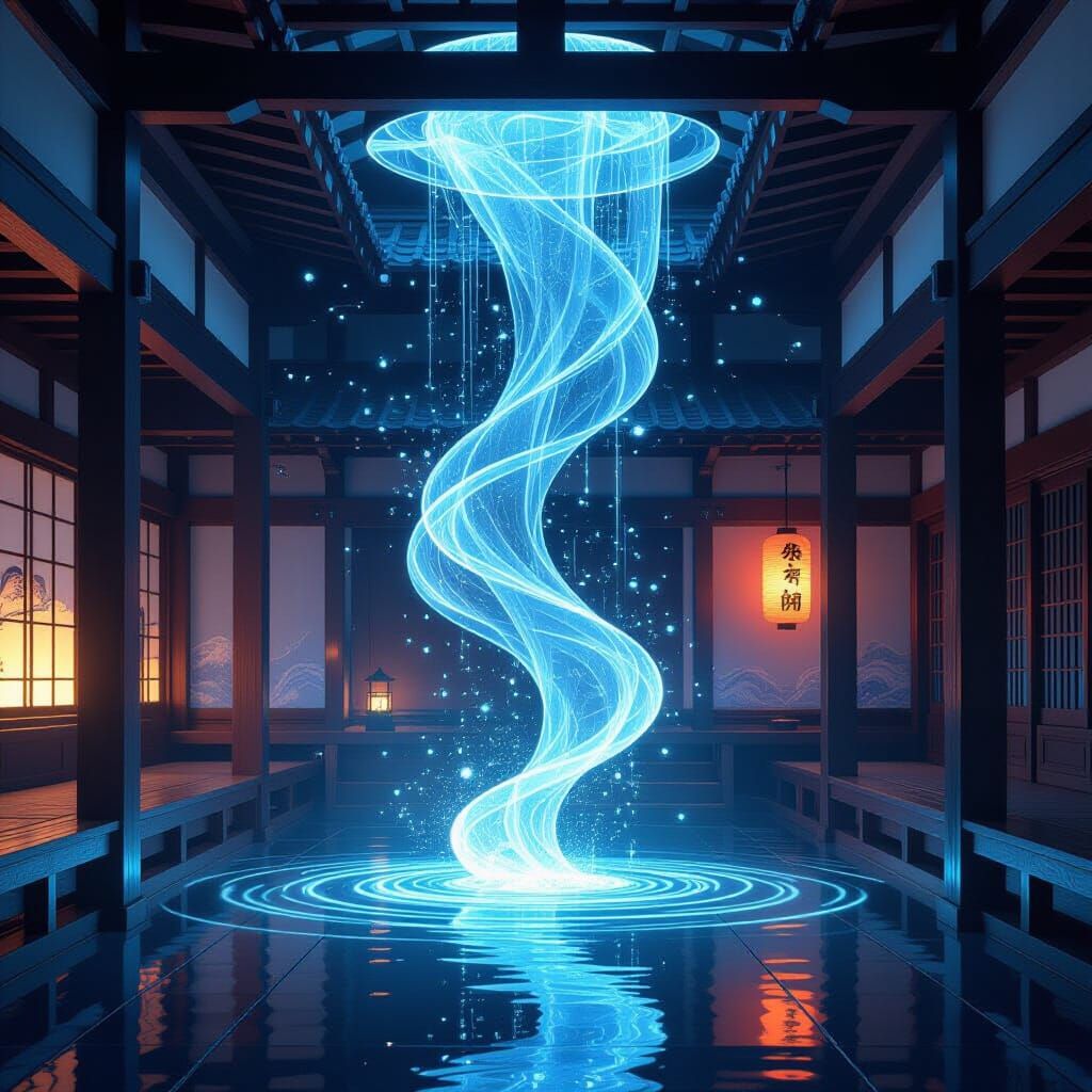 This image showcases a translucent, flowing house spirit in a traditional Japanese home. The abstract art features vibrant blues and oranges, with subtle lighting and intricate details.