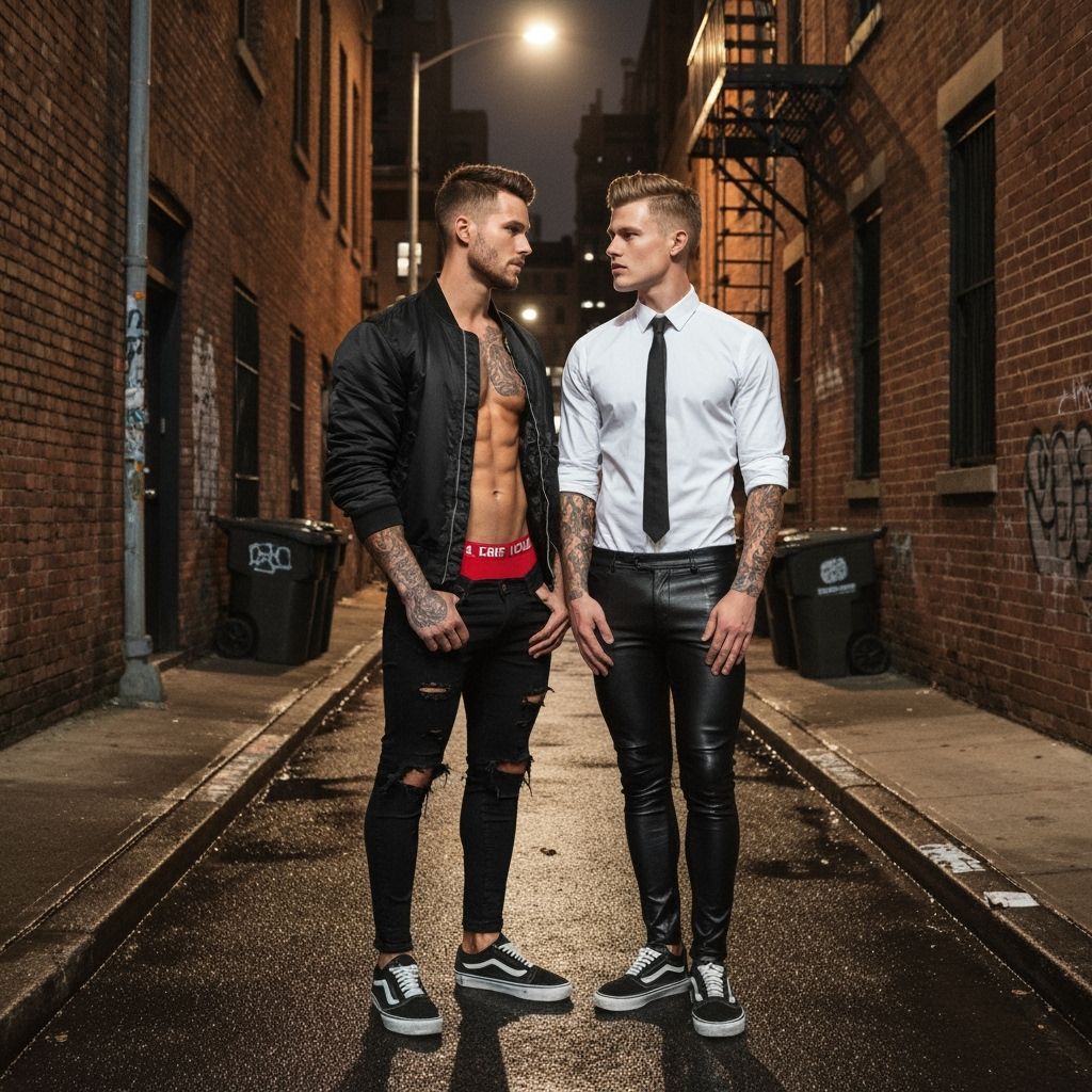 A narrow, glistening Manhattan alleyway at night, lit by dim streetlights and neon reflections on wet pavement. Two tall figures stand silhouetted amidst the gritty urban scene in a cyberpunk aesthetic.
