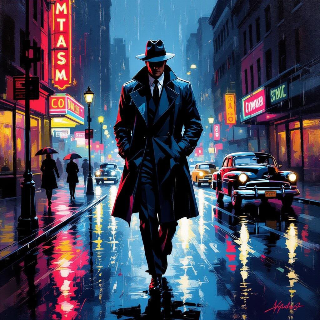 This image shows a handsome man in vintage attire walking down a wet city street at night. Neon signs reflect off the ground in this oil painting with bold brushstrokes and dramatic lighting, in the style of moody realism.