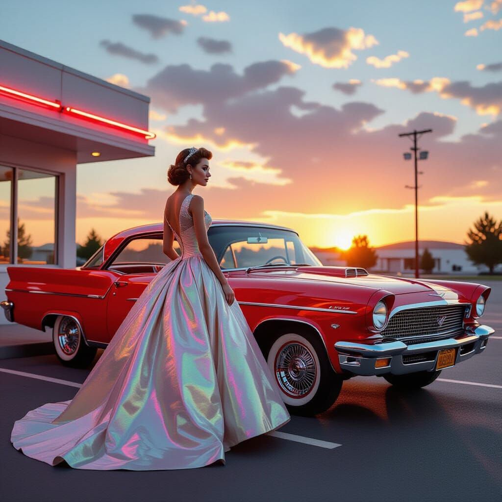 This image captures a woman in a stunning 1950s haute couture gown beside a classic muscle car. The scene, set in a retro diner lot during golden hour, features dramatic lighting and vivid colors, reminiscent of classic fashion photography.