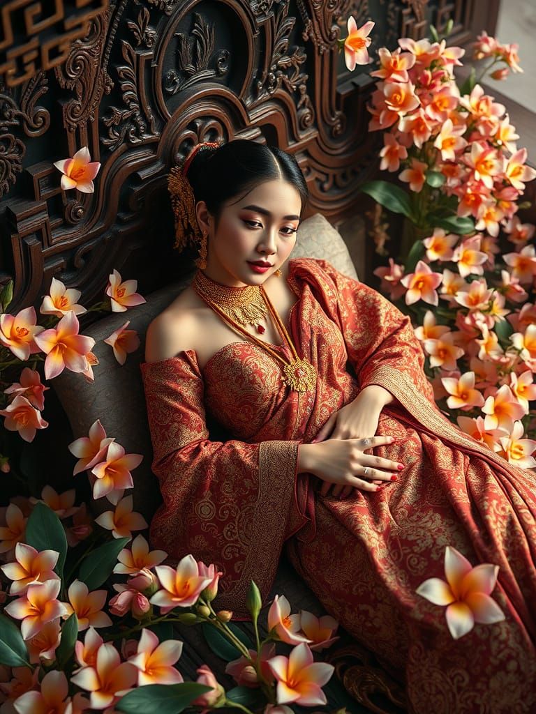 A striking picture of a Thai woman in traditional dress reclining on an ornate bed. The scene is filled with thousands of flowers as digital matte painting.