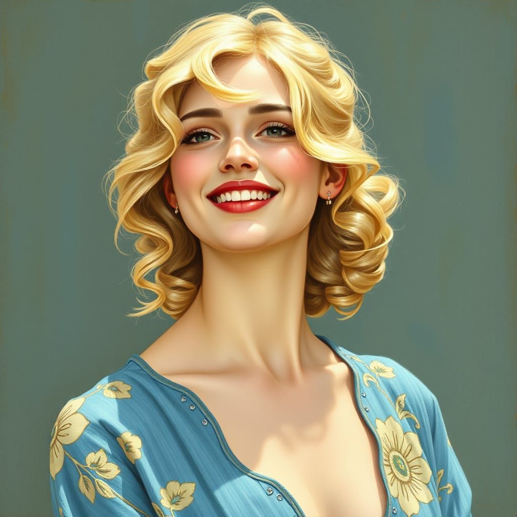 This image depicts a smiling European woman with blonde, wavy hair, wearing a light blue dress with delicate floral patterns, in a soft, pastel color palette with ornate details and a feathery light effect, reminiscent of Art Nouveau style