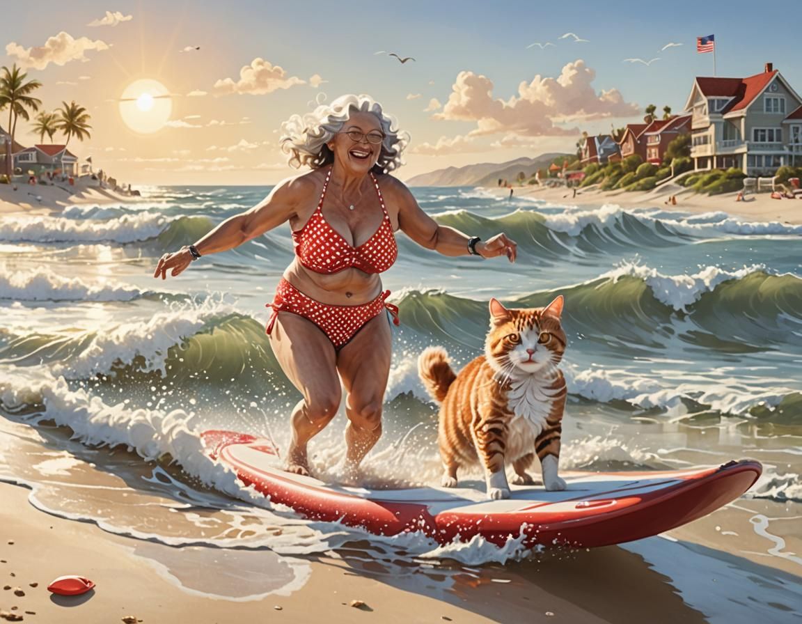 A whimsical image of a curvy grandmother surfing with her cat. They are on a sunny beach with a warm glow on the water and sand. A lighthearted and joyful scene.
