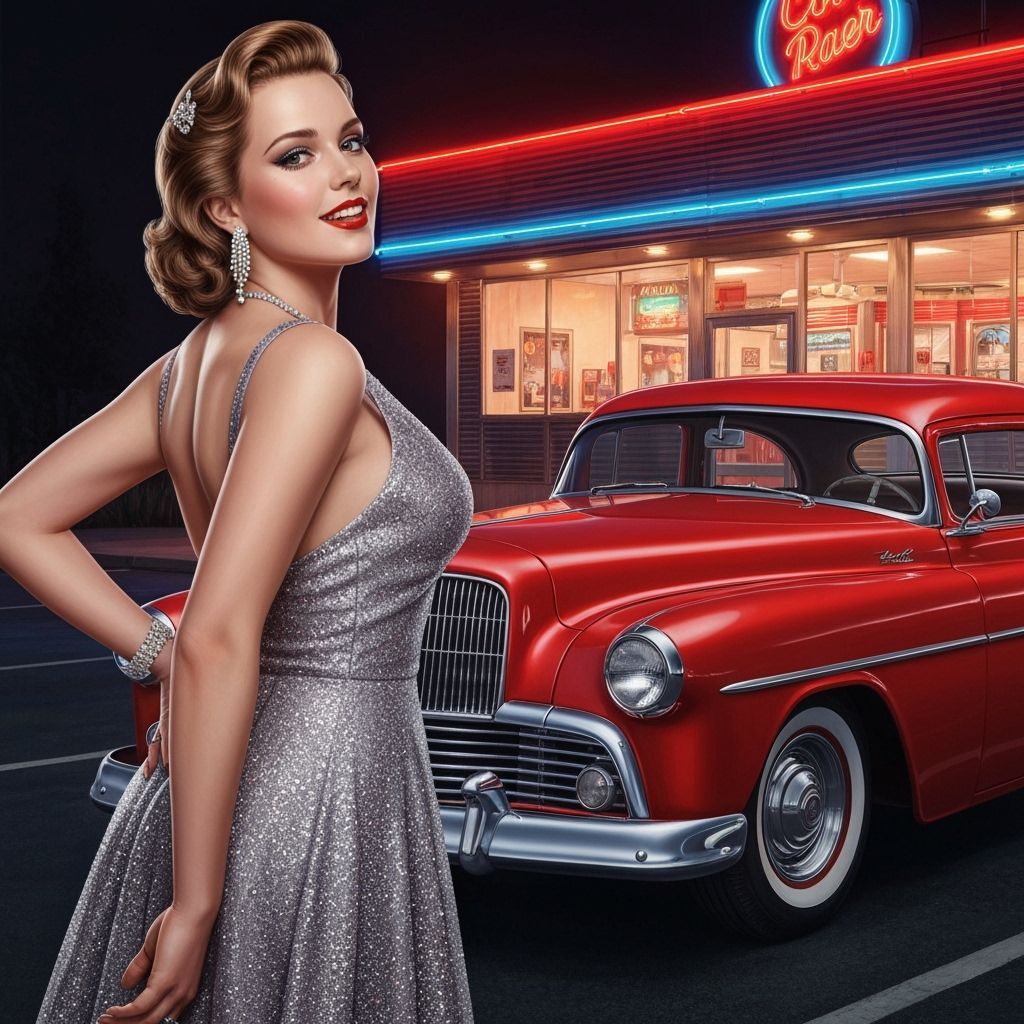 A captivating image of a blonde pin-up model in a glittering dress, posed on a classic car outside a diner. This image showcases a pop surrealist aesthetic with hyperrealistic rendering.