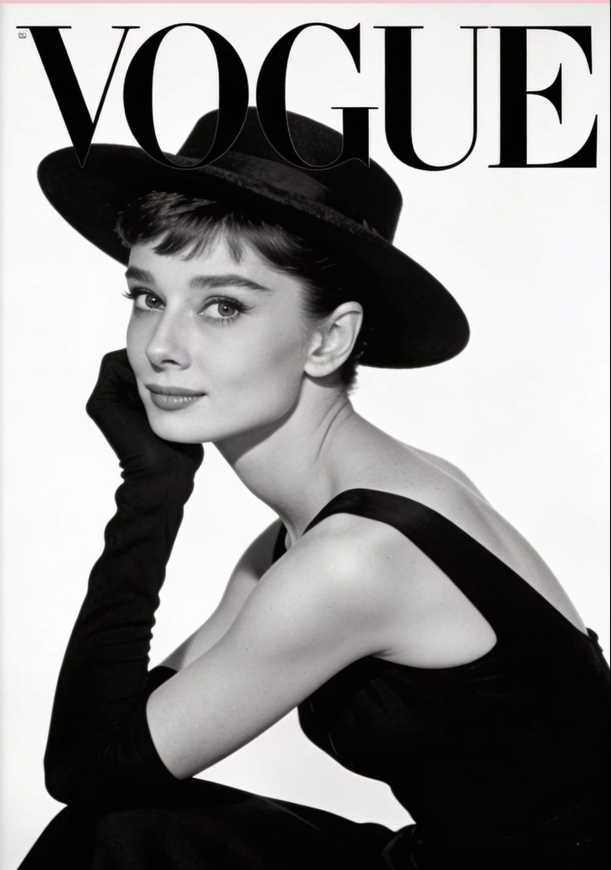 This image shows Audrey Hepburn in a stylish, elegant magazine format, featuring Vogue-style typography. It captures a classic, fashionable aesthetic.