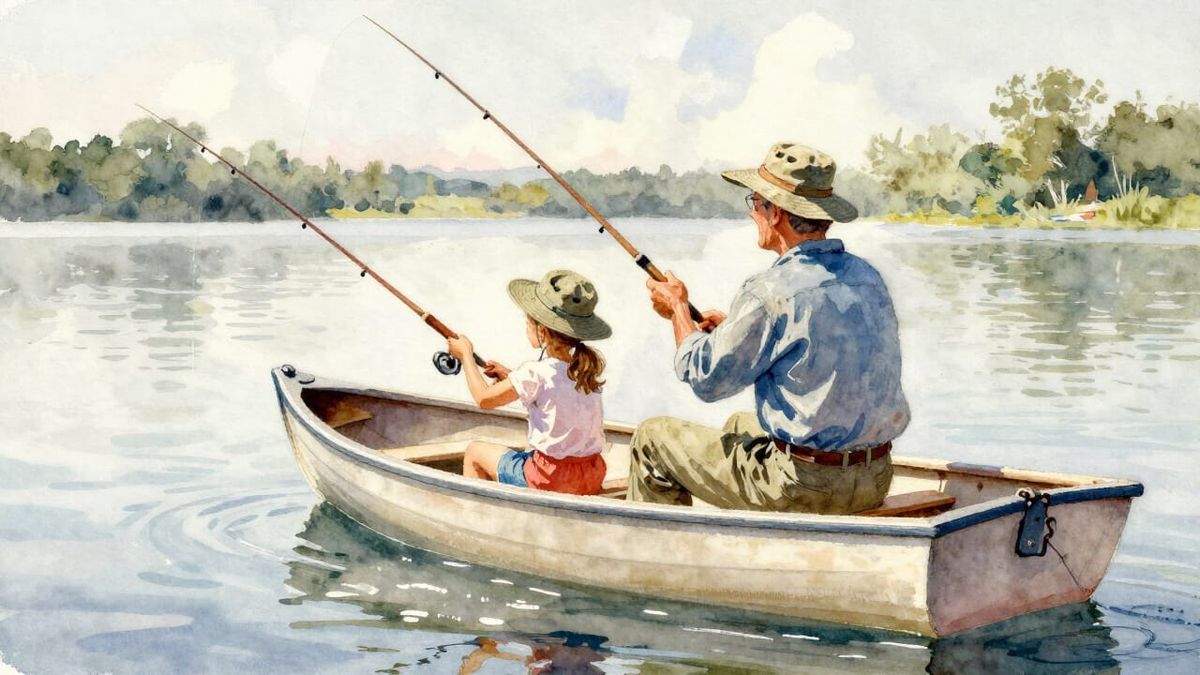 This heartwarming watercolor shows a grandfather and granddaughter fishing from a rowboat. It features loose brushstrokes and vibrant colors, capturing their joyful connection in soft daylight.