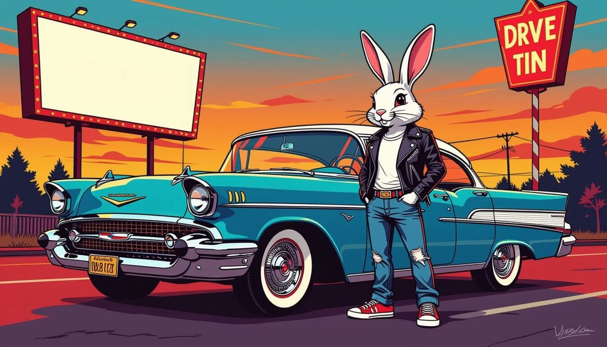 This image shows a stylish rabbit in retro attire next to a classic blue 1957 Chevy with flames, at a 1950s drive-in. Rendered in a vibrant comic book art style with bold outlines and saturated colors.