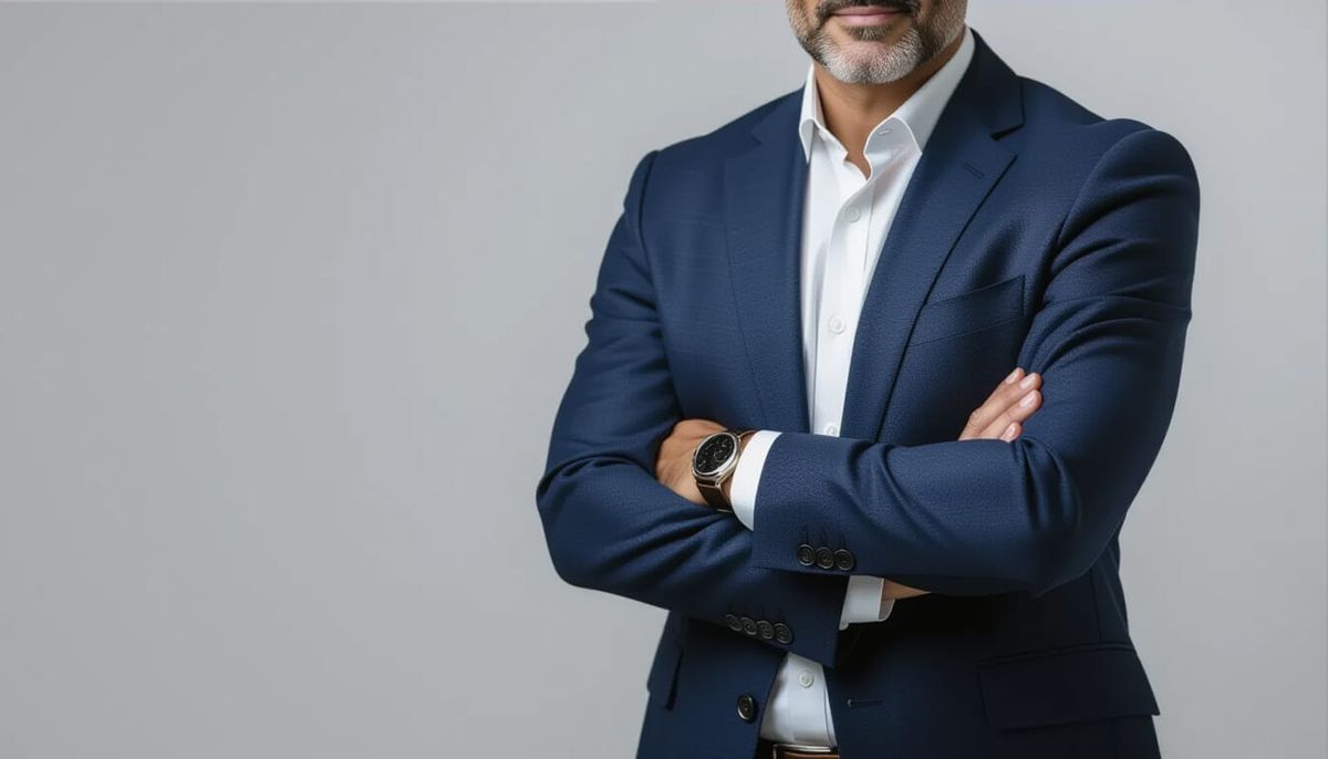 A portrait of a confident male executive in formal attire, arms crossed. The image evokes corporate photography with vibrant colors and sophisticated lighting.