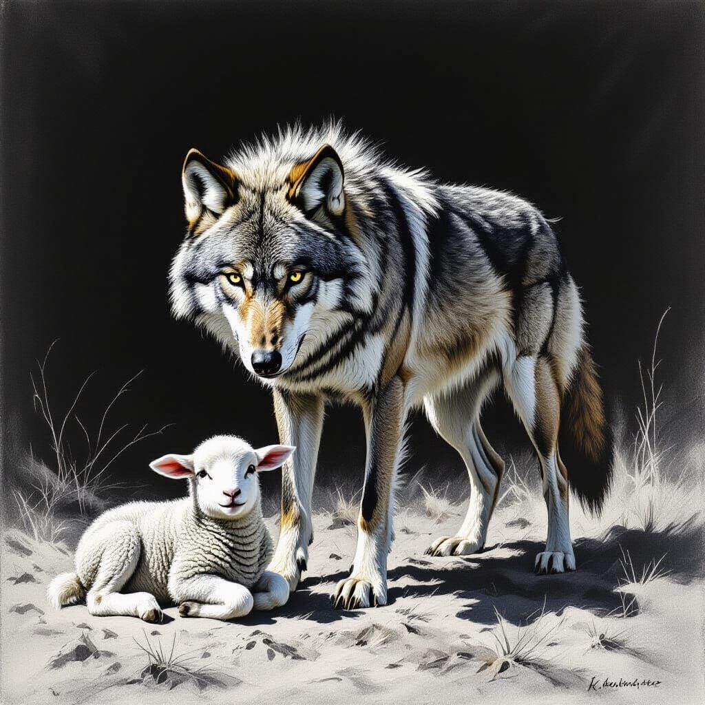 This image is a hyperdetailed charcoal drawing depicting a lean wolf looming over an innocent lamb. It features dramatic chiaroscuro lighting and a stark landscape, evoking tension and desolation.