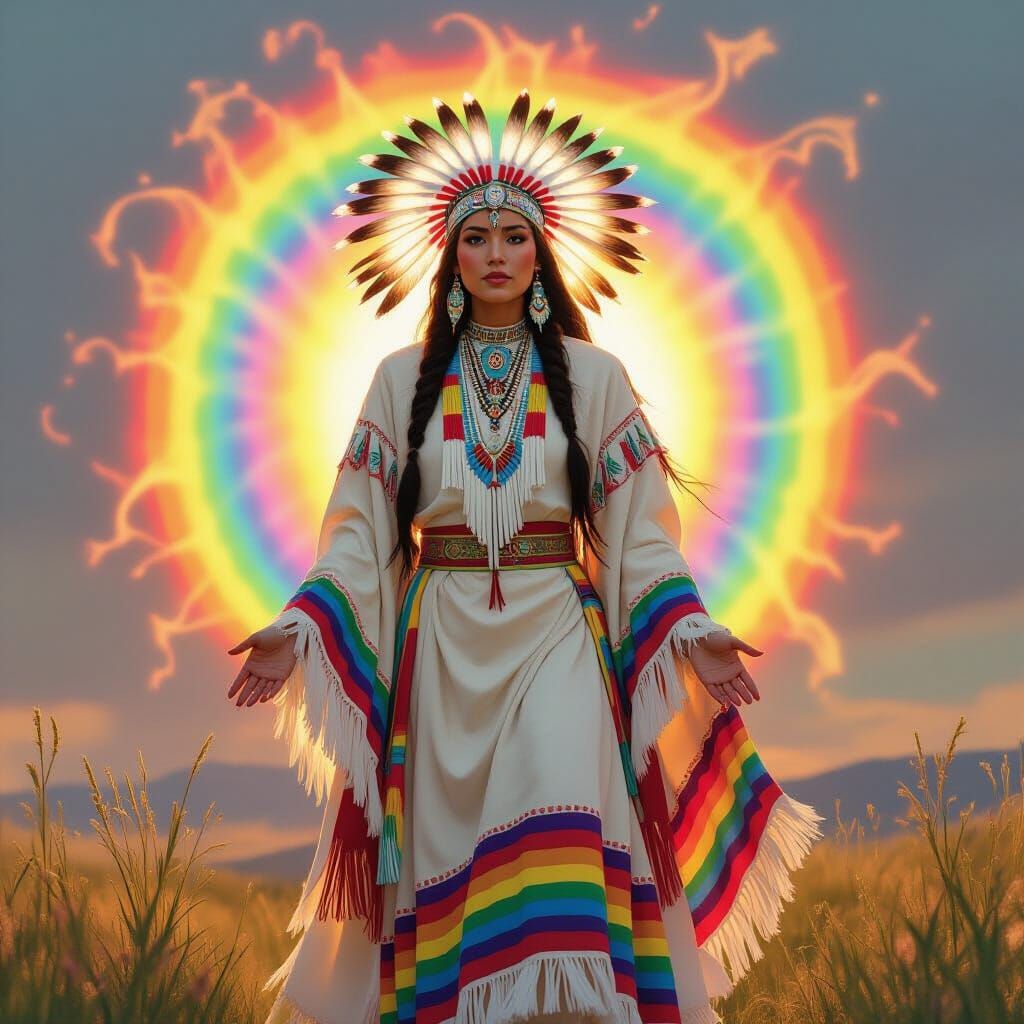 This image depicts the White Buffalo Calf Woman in a vibrant rainbow Lakota dress, surrounded by swirling light. The scene evokes spiritual power and harmony with luminous, saturated colors and majestic atmosphere, rendered in a highly detailed, ethereal style.