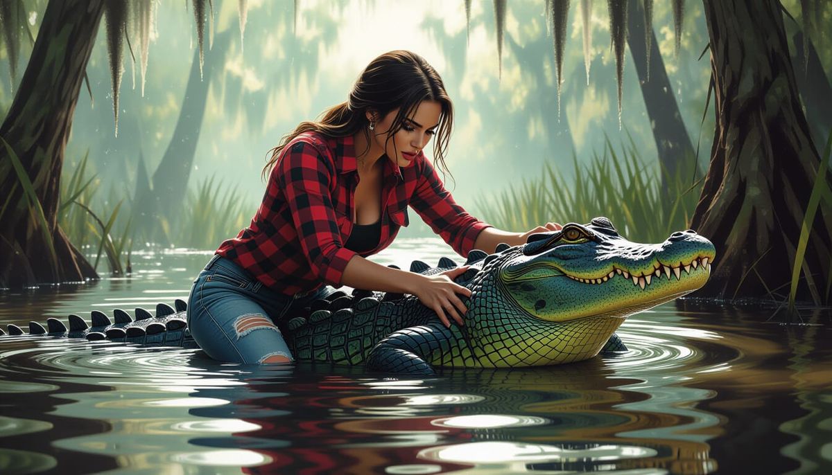 This image shows a woman in casual clothing wrestling an alligator in a swamp. The image is rendered with high contrast shadows in a photorealistic noir style.