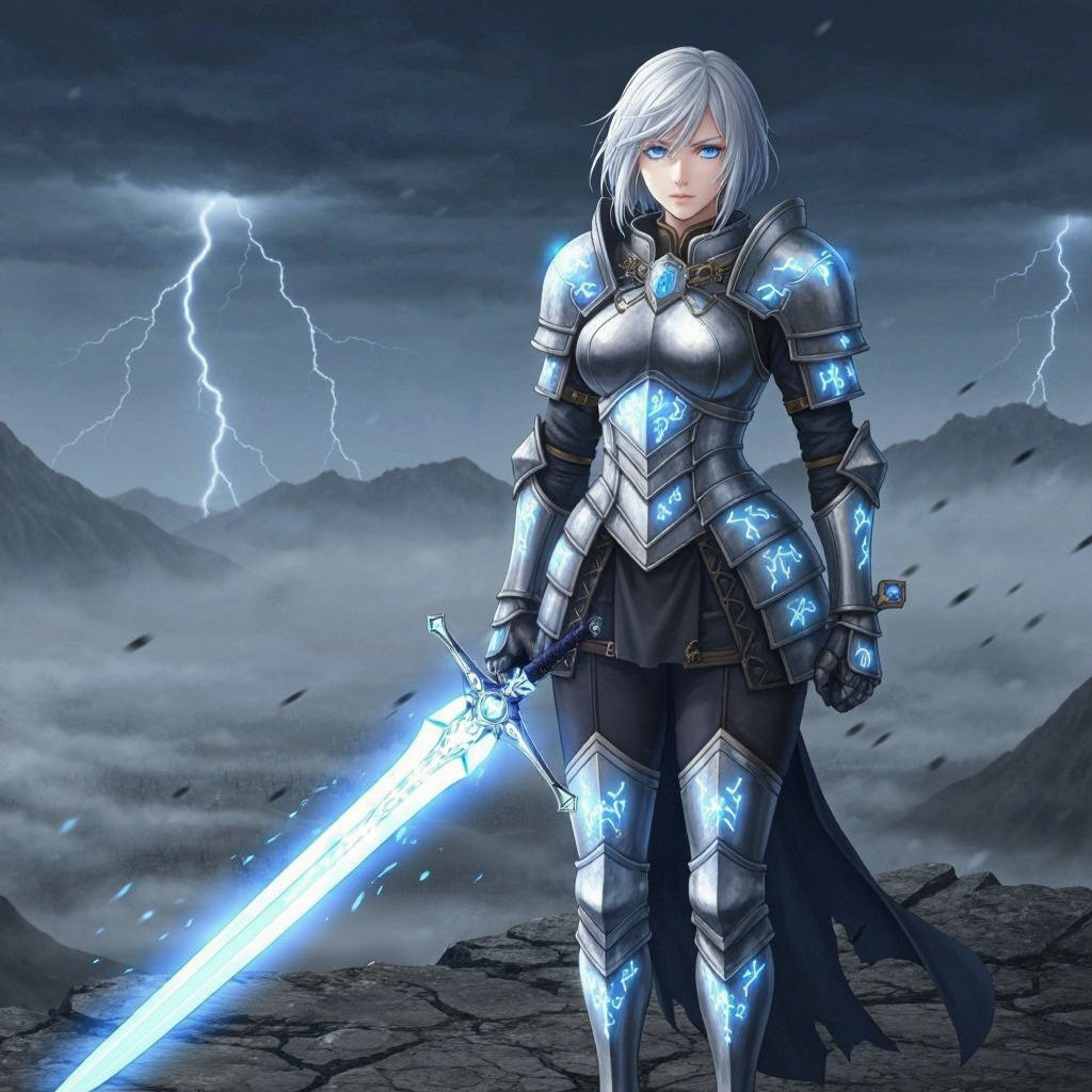 A lone anime valkyrie stands on a mountain, overlooking a battlefield. Lightning illuminates her determined expression. The image is rendered with high contrast and dramatic lighting in an action-packed anime style.