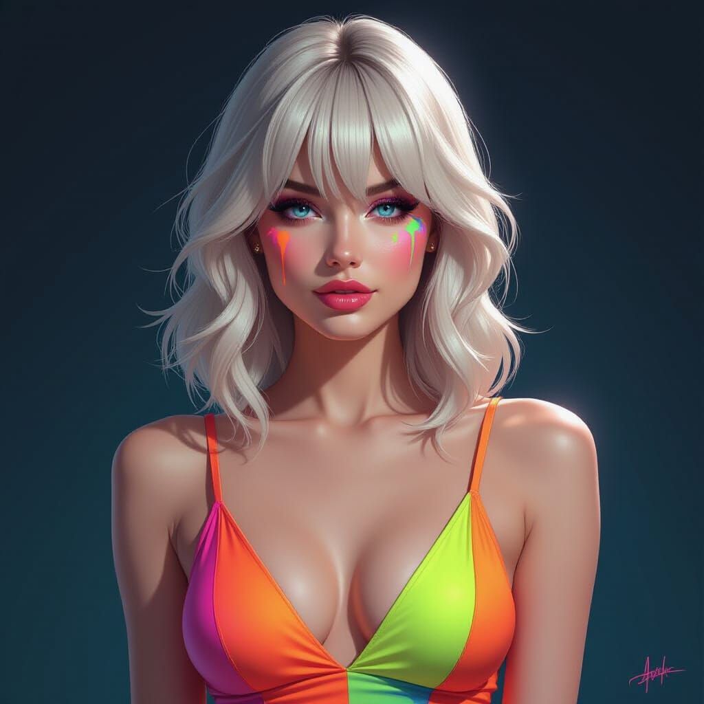 This digital painting features a woman with blonde hair and blue eyes, her face accented with vibrant neon paint splatters. She wears a brightly colored, form-fitting dress illuminated against a dark background.
