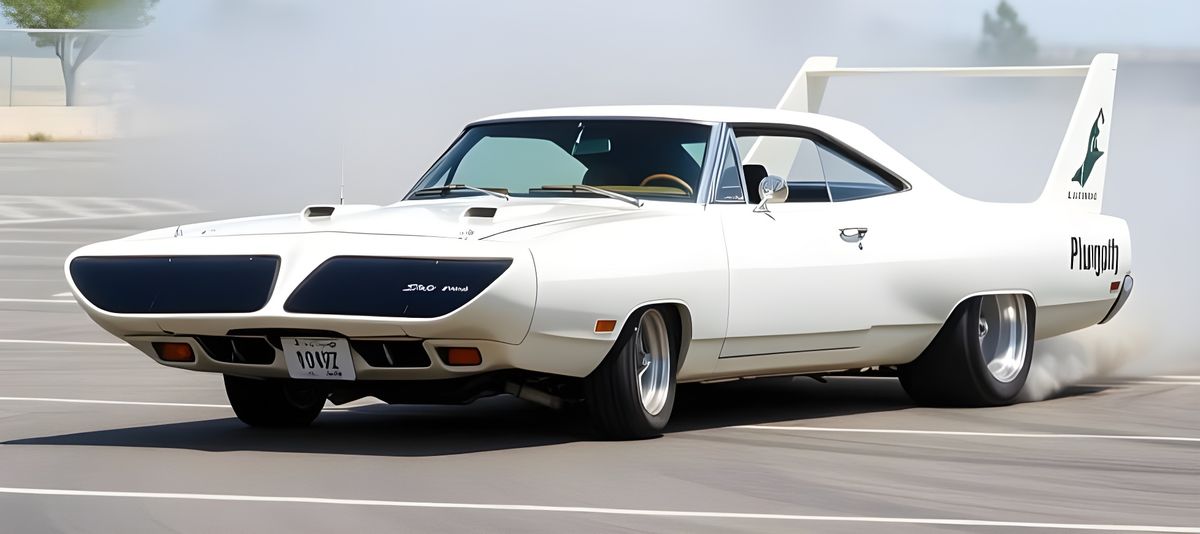 This image shows a white 1970 Plymouth Superbird restomod drifting in a parking lot. The car has a lowered suspension and wide tires, capturing a dynamic action shot.