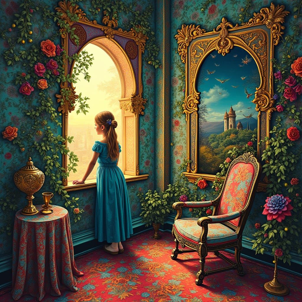 This artwork features intricate Andalusian patterns and lush leaves in a vivid palette of emerald, sapphire, ruby, and gold, creating a dreamlike tapestry.