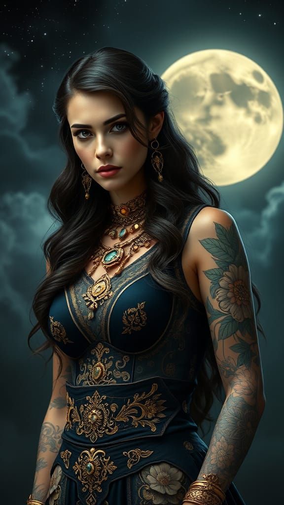 This image shows a mystical young woman with a contemplative gaze, set against a starry night sky and full moon, adorned with intricate floral tattoos and elaborate Art Deco jewelry, in a rich, dark color palette with deep blues and golds.