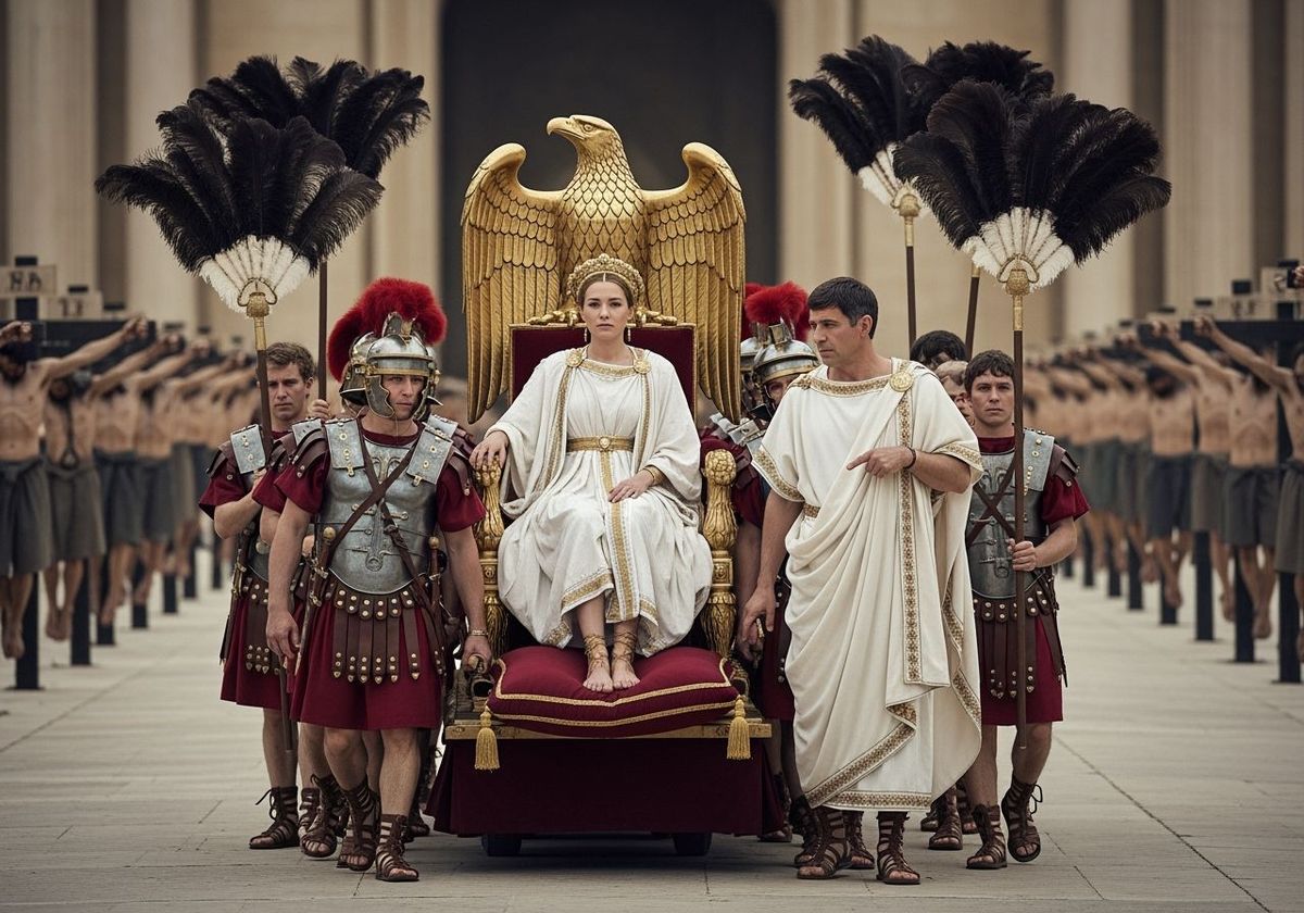 This image shows a Roman Empress carried on a golden eagle throne by soldiers. Servants with fans attend her while crucified peasants line the background, captured with sharp focus and natural lighting.