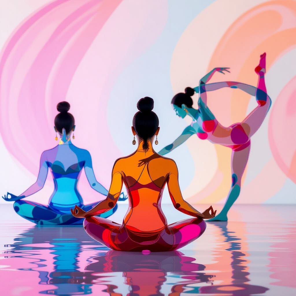 This image shows three women with bodies formed from colorful glass beads, practicing yoga. One is meditating, another dancing, and the third is stretching, all against an expressive backdrop in dreamy, abstract styles.