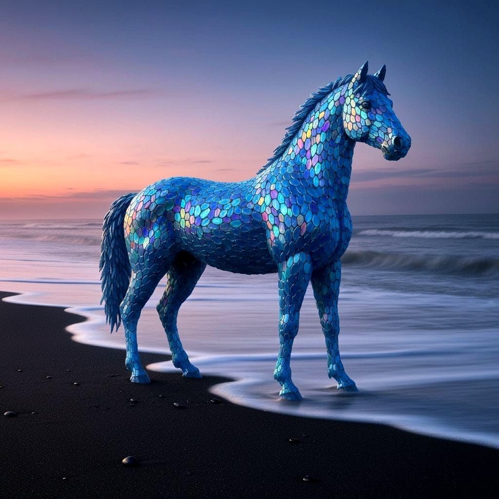 A captivating image of a stallion sculpture crafted from iridescent blue sea glass on a black sand beach. The sculpture catches the sunset, casting a spectral glow as waves create an ethereal mist in a surreal landscape.