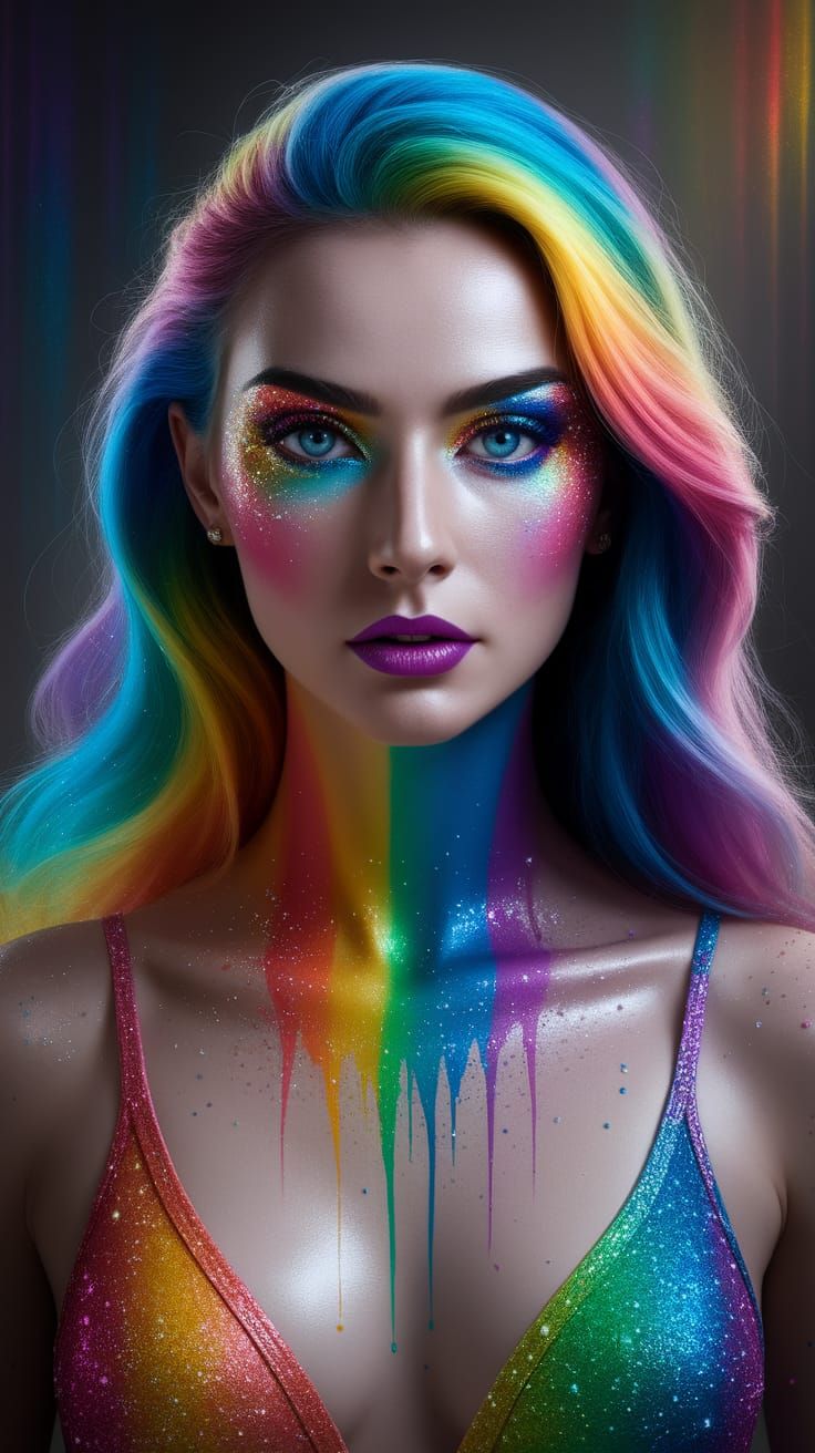 Easily generate stunning portraits with vibrant rainbow colors and glittering effects using our free AI image generator